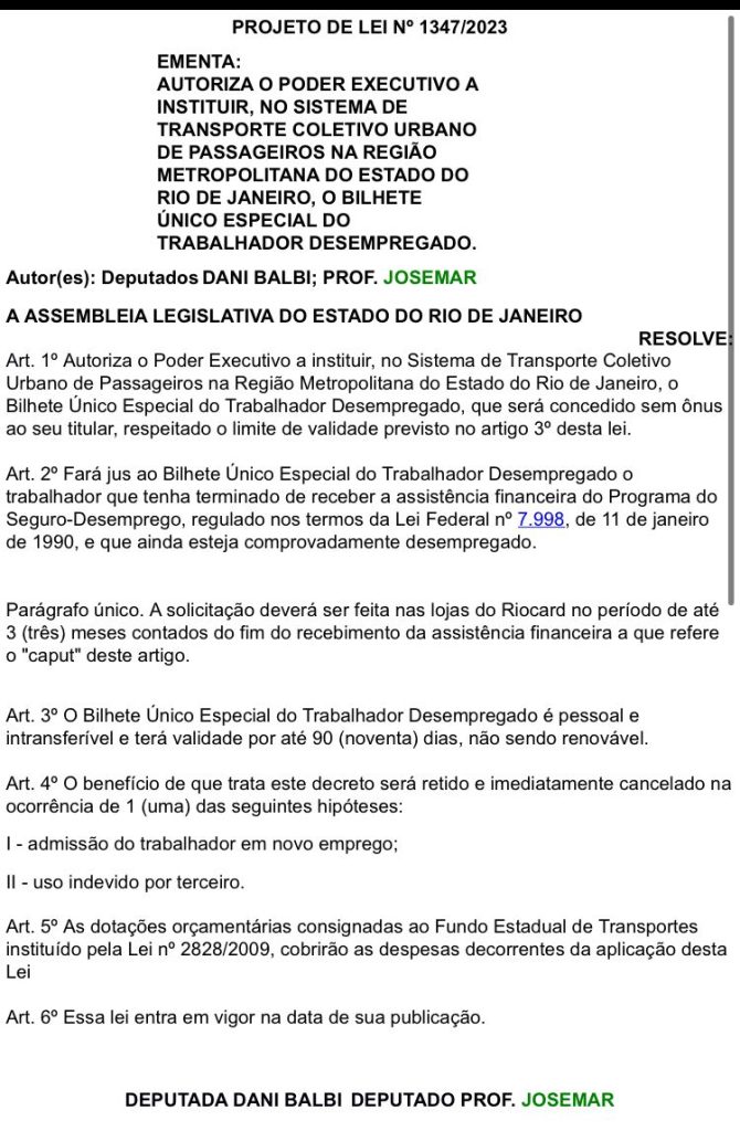 PL 1347/23 – Autoriza o Poder Executivo a instituir o bilhete único do trabalhador desempregado no transporte coletivo da Região Metropolitana