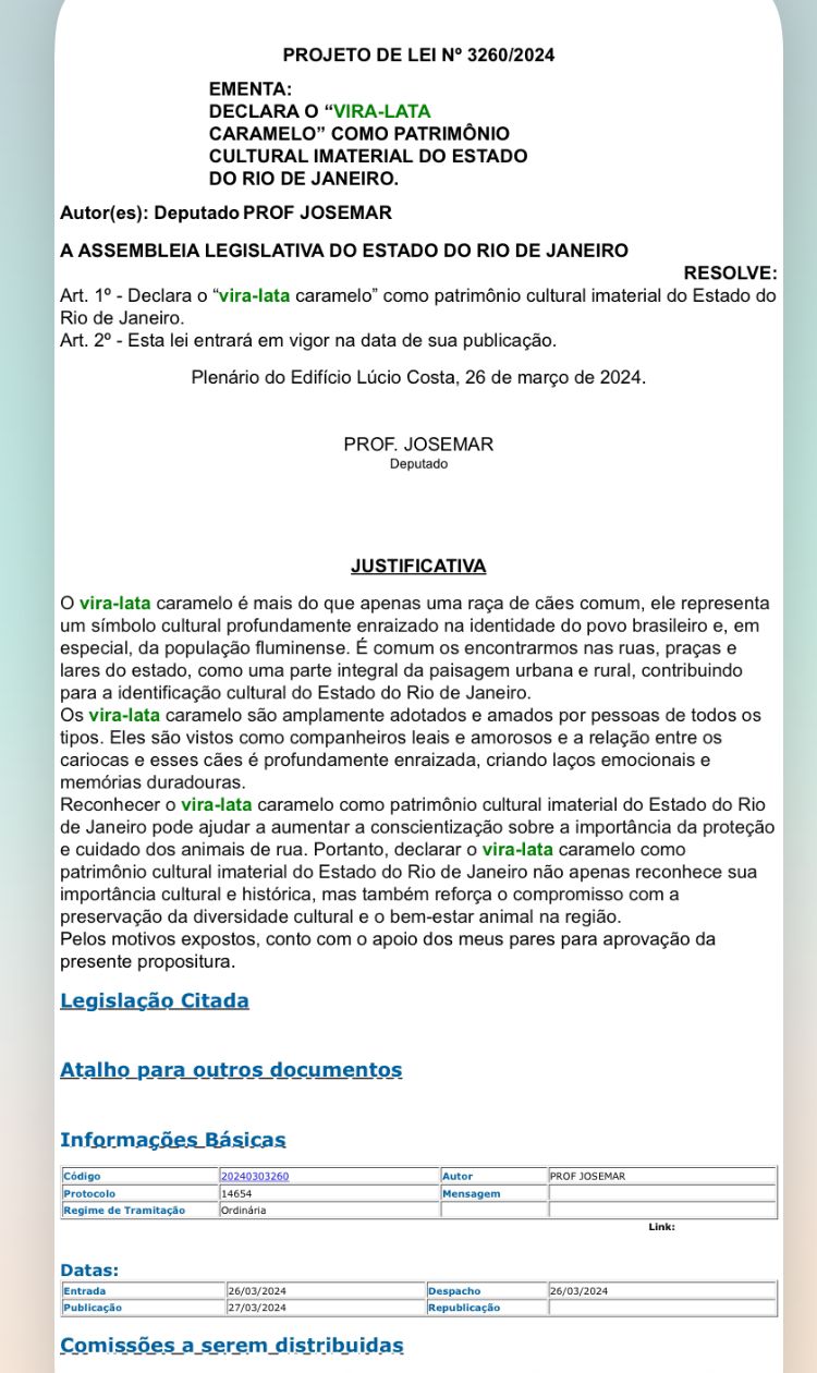 PL 3260/24 – Declara o “vira-lata caramelo” como patrimônio cultural imaterial do Estado do RJ